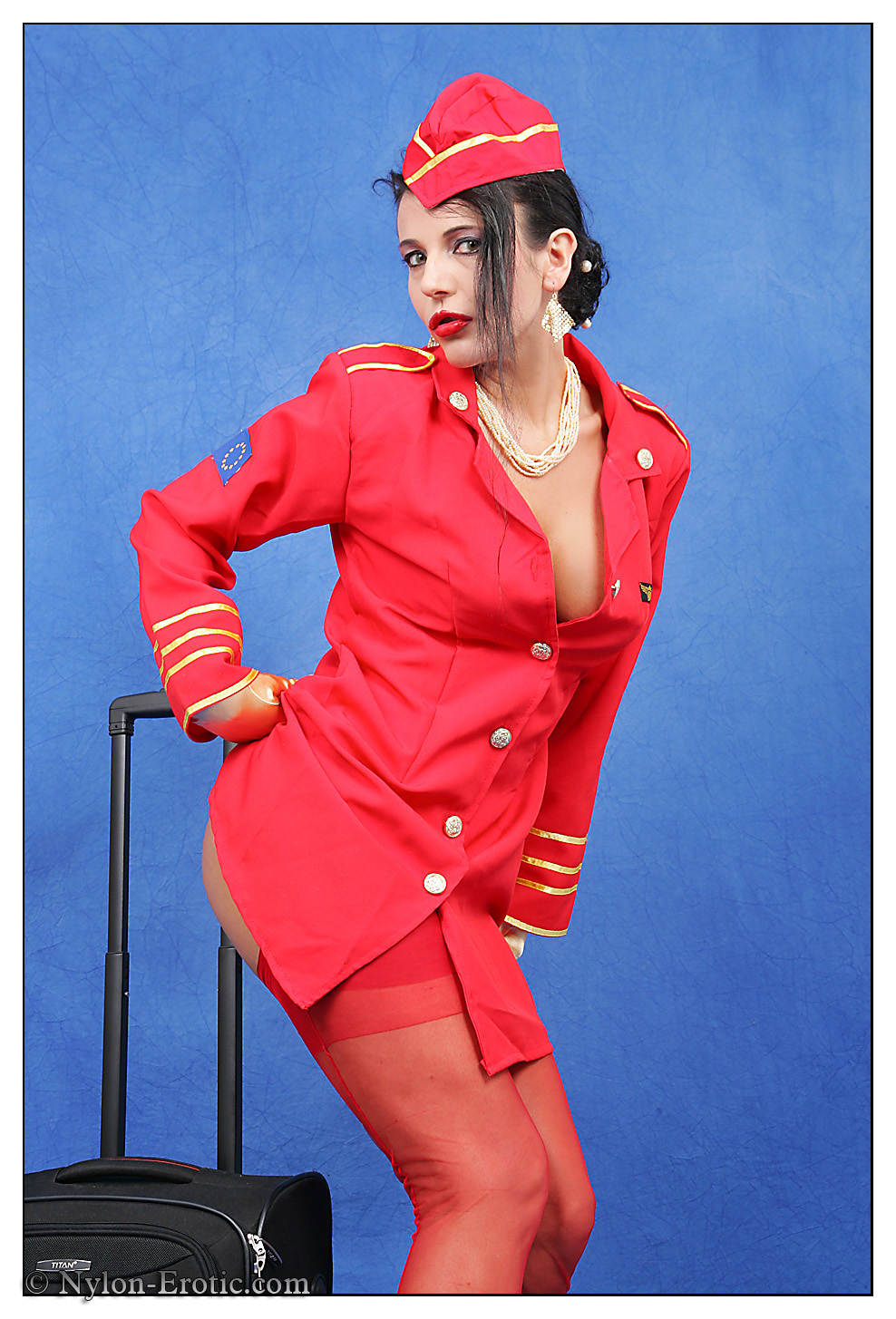 Leggy brunette stewardess posing in her sexy red uniform with matching lingerie and stockings